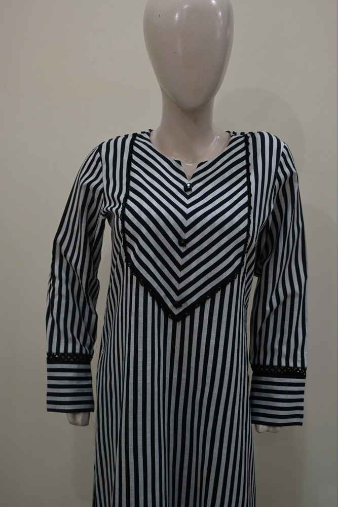 Black.& white stripes.Black lace & buttons on neck also lace on bottom and sleeves.( 2pcs)